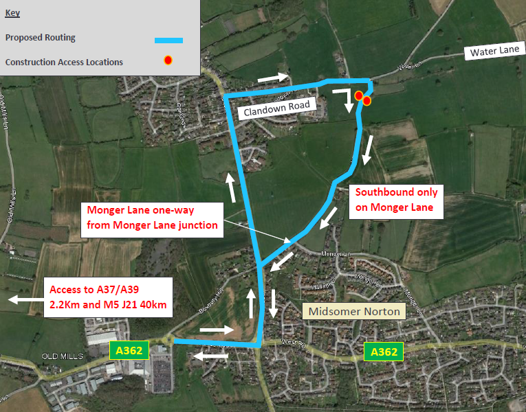 Access to the site would be obtained from three existing agricultural accesses located on Monger Lane and Water Lane, and one new access to a Point of Connection on Water Lane. The access on Water Lane, when operational, would be for emergency use only. All accesses would be upgraded to accommodate construction vehicles. The short construction period (eight - nine months) means that any disturbance to residents would be kept to a minimum.