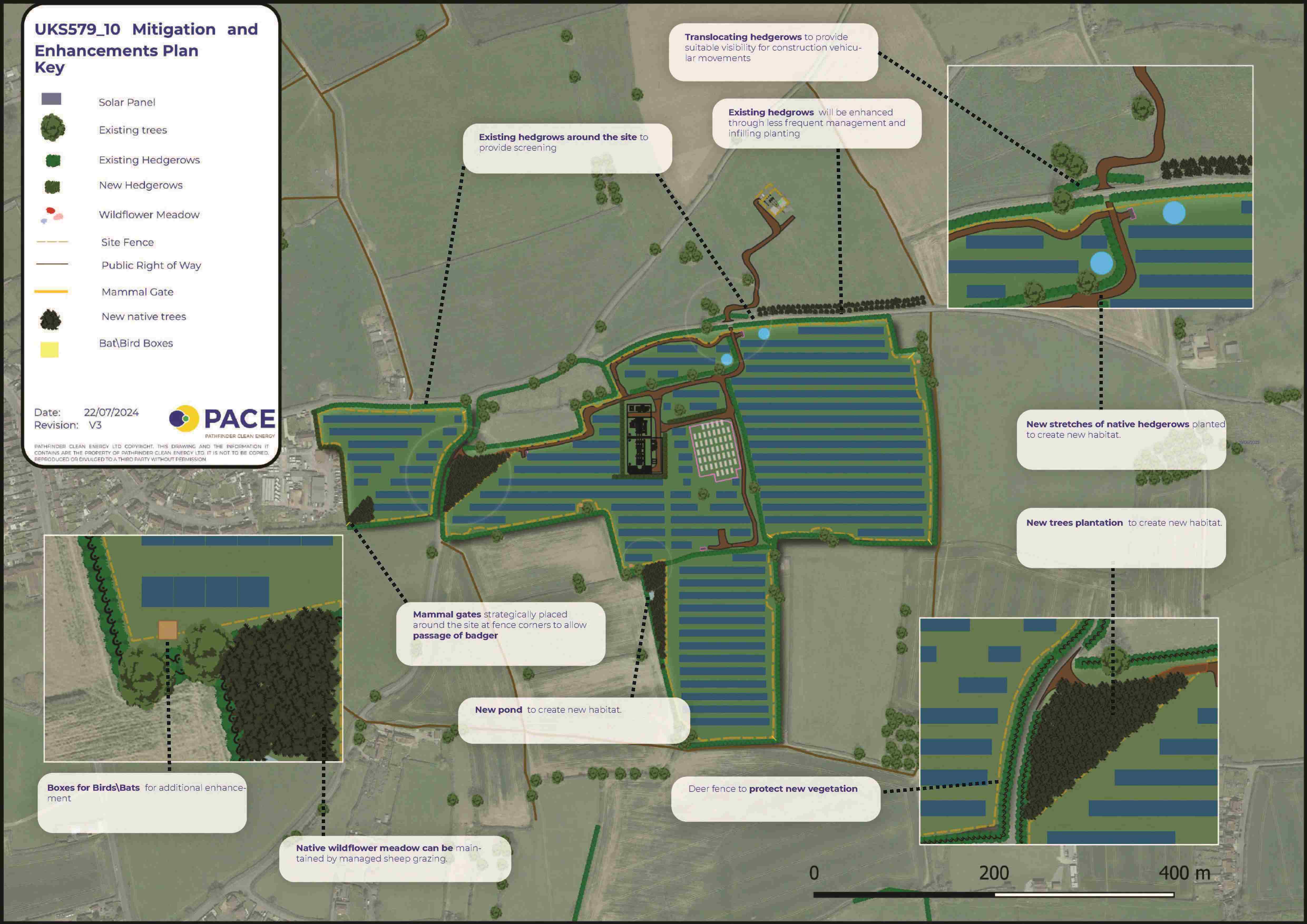 In response to feedback received during the public consultation held in January 2024, as well as the results of site surveys and assessments, PACE has made a number of changes to the proposal, which include: introducing new hedgerows to the western edge of the site, relocating the BESS infrastructure to the middle of the site, reducing it (from approx. 63 BESS units to 36 BESS units) and introducing an acoustic wall.
