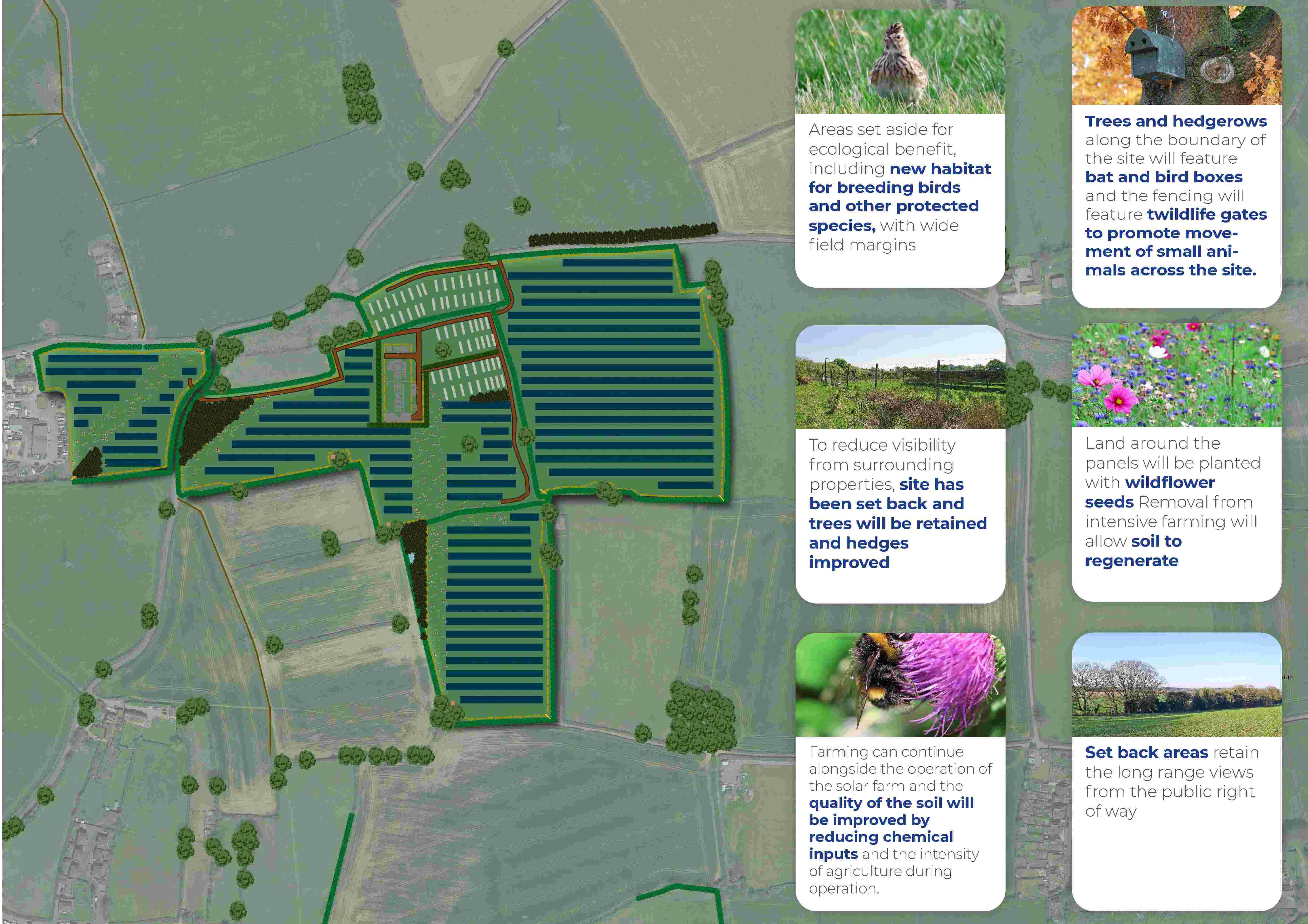 Solar farms take up a very small proportion of the land they occupy, leaving huge scope for biodiversity. Research has shown they improve the diversity and abundance of broad leaved plants, grasses, butterflies, bumblebees and birds, including those with conservation status. Details of the enhancements we would provide can be found in the graphic.